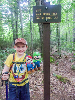 The Summer is flying by ever so quickly. I had read how Mt Hale was one of the "easier" 4000'ers, plus it was on the NH Fire Tower list as well. Bonus. We were up and on the road early and about halfway up it turned very overcast and some raindrops started to fall. This hadn't been in the forecast I had read. I quickly looked again and sure enough, "7% chance of rain".. We drove in and out of some relatively heavy downpours, but I was determined to keep going. You never know what the weather might be like on the other side of Franconia Notch, plus I felt that if it wasn't raining when we arrived at the trail head, we would take a chance and head up anyway.. the trail was only 2.2 miles long, I had not read about any rock slabs or ledges that might be treacherous in wet conditions, plus this was a viewless summit, so if we were in cloud it wouldn't matter. We arrived at the Hale Brook trail head on Zealand Road around 8:30am and geared up. I had driven past Zealand Road so many times on our way to Bretton Woods for skiing or various races over the years, I have been chomping at the bit to do this hike and cross it off the various lists it sits on. The trail was damp, but never really wet. The climb is moderate (per my definition) but nothing crazy. There were no real flat sections, it was (or at least it felt like) climbing the entire way.. but I never stopped at any point thinking "I can't do this anymore".. naturally I had to take breather breaks and normal rests, but I was never thinking "make it stop".. which I have done before. I could tell we were hiking up into cloud, which had the boys rather fascinated. It was slow going for a 2.2 mile trail, but we eventually made it to the summit, which is basically a small field with a large cairn in the middle. There are some of the former fire tower artifacts. But no views to speak of. After a quick snack and a couple of summit pictures, we headed back down. It sprinkled on us a little as we headed down, but soon we were under thick cover and didn't get wet at all. We passed a few parties on our way down. I think the viewless summit on an overcast day is a draw for anyone who needs this on their NH48, just like us! Back at the trail head and another successful hike for our little trio. I know the boys would never voluntarily say "hey, let's go for a hike".. but afterwards when I always ask "did you have fun?".. hearing "oh, it was good".. is success enough for me. I'm so glad we got at least one 4K in this Summer.