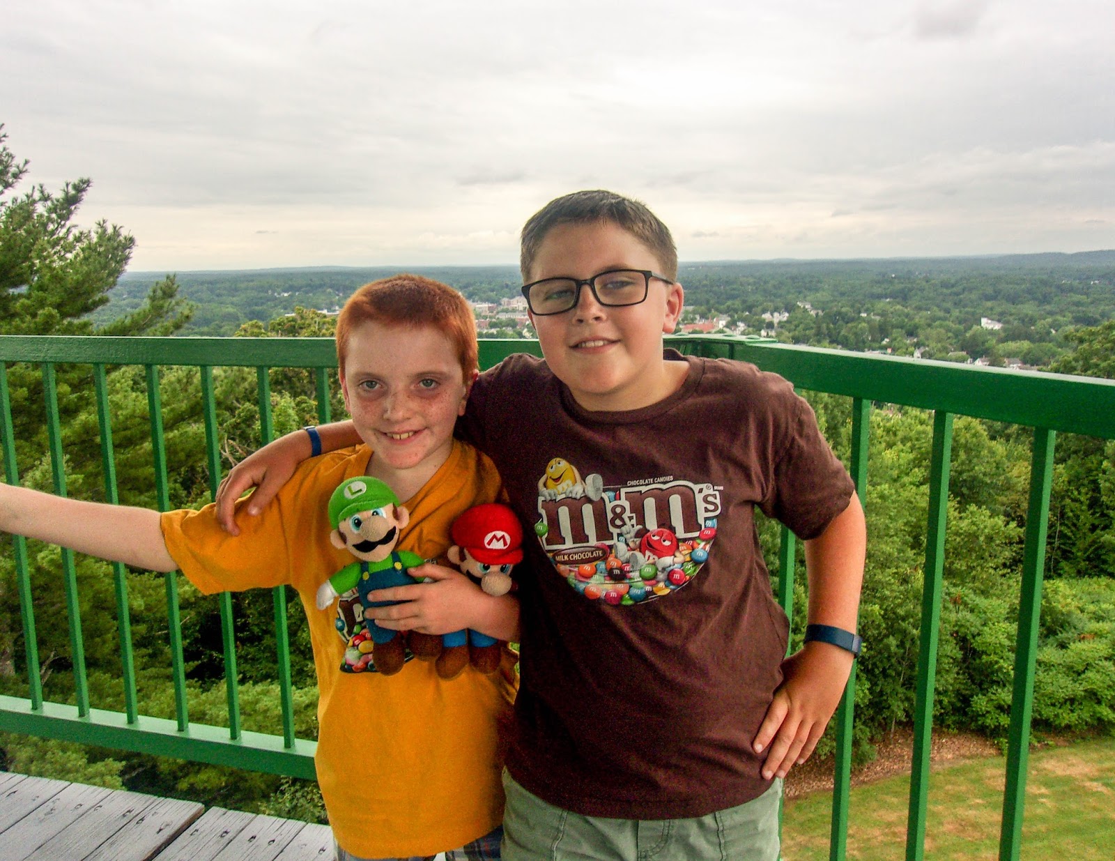So Day #1 dawned with rain, which wasn't going to stop me. We headed first for Garrison Hill Fire Tower in Dover. Which is ironic, because I lived down the street for 2 years and have driven past at least a gazillion times, but had never actually taken the turn up the rather steep Abbey Sawyer Memorial Highway (odd name for a little side street) to Garrison Park and the fire tower. It is relatively well maintained, with some picnic tables and plenty of greenspace for the kids to run around. I can see that it might be a good hideaway hangout with its somewhat hidden location.. beer can remnants were a confirmation of that. We headed up the tower anyway, which is dauntingly tall for someone with a fear of heights.. but extremely sturdy. Definitely the biggest fire tower I've been on, not sure about height, but overall width and size of platforms etc.. the top has a 360 degree platform (stairs come up the middle) with a metal bench and everything! Aidan was excited as there was a Pokemon ball painted at the top of the stairs. He quickly took out his Pokémon Go app and discovered it's actually a "Pokémon Gym".. whatever that means, although he wasn't able to overturn it. We took the obligatory pictures, a quick video, then descended and made it back to the car right before the heavens opened up and it started raining.